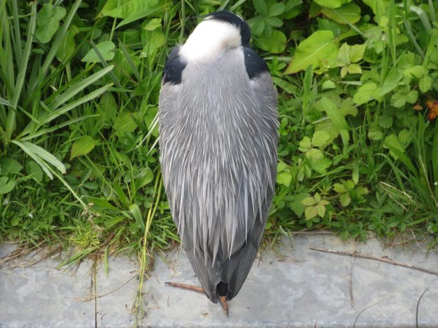 Sieste d’un héron cendré depuis la passerelle du parc Martin Luther King, 17e.