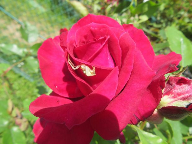 Araignée crabe, Misumena vatia, embusquée dans une rose au jardin de Belleville, 20e.