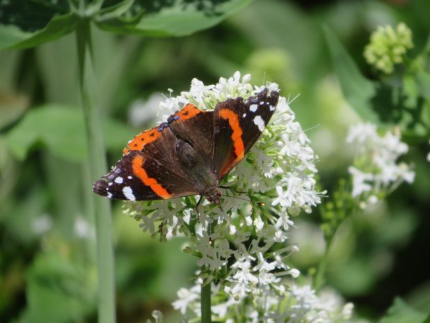 Vulcain butinant une fausse valériane blanche dans le jardin Villemin, près du canal st Martin, 10e.