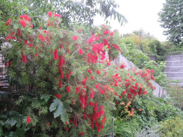 Trio de Callistemon citrinus au jardin Nelson Mandela, dans le centre de Paris.