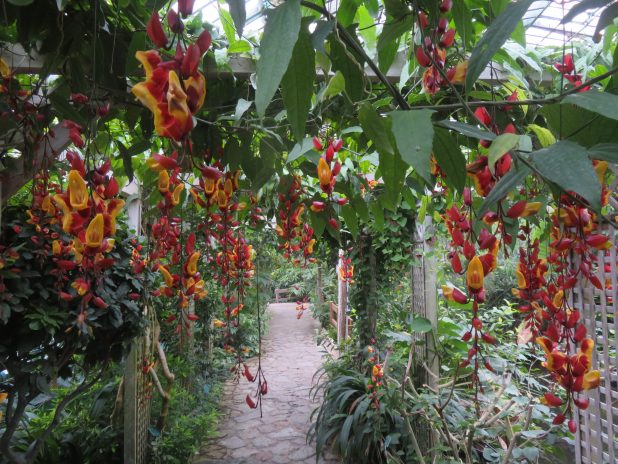 Pendeloques du Thumbergia de Mysore sur la pergola, dans une serre du jardin d’Auteuil, 16e.
