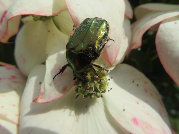 Cétoine doré butinant un Cornus kousa, à l’arboretum de la Vallée aux Loups, 92.