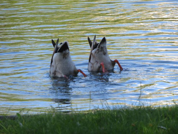 Préparation aux épreuves de natation synchronisée chez les canards colverts, au parc du Chemin de l’Île, à Nanterre, 92.