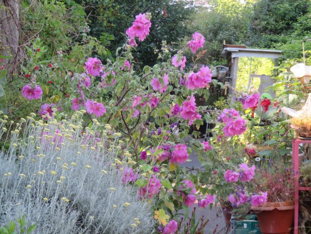 Jolie scène parfumée de » plante curry « , au jardin partagé Ecobox, quartier de la Chapelle, 18e.