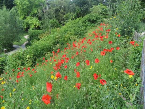 Talus fleuri de coquelicots au parc de l’île st Germain, à Issy les Moulineaux, 92.