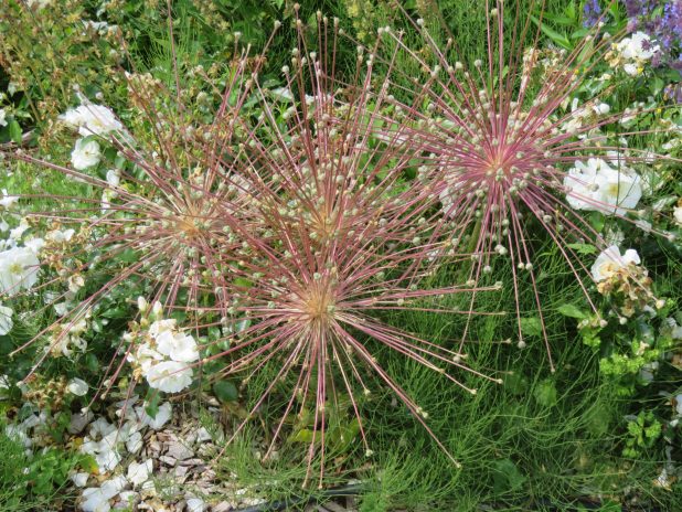 Même après la floraison, les infrutescences d’Allium shubertii restent décoratives, au jardin de l’école du Breuil, 12e.