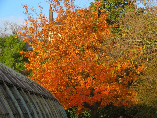 Couleurs d’automne sur les Liquidambar du jardin du dragon, au parc de la Villette, 19e.