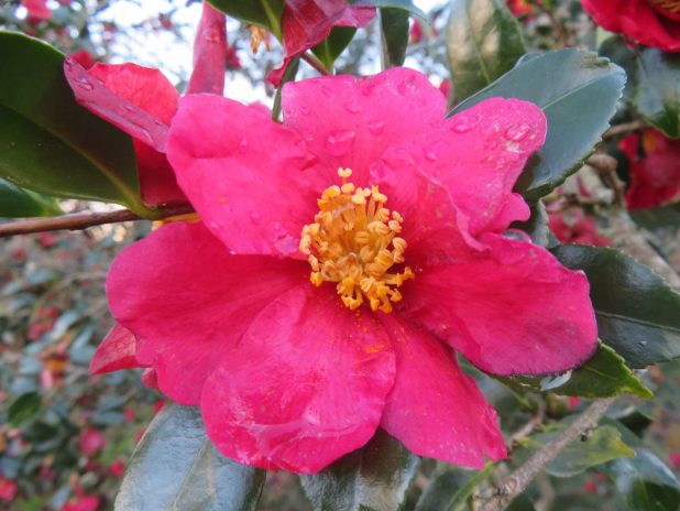 Fleur de Camellia sasanqua, dans la collection d’Hydrangea, à l’arboretum de la Vallée aux Loups, 92.